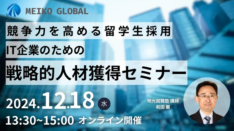 2024年12月18日(水)13:30から、IT企業向けの「競争力を高める留学生採用」セミナーがオンラインで開催されます。このセミナーは、急速に進化するIT業界において、技術者不足が問題となる現在、企業が留学生をどのように採用し、活かしていけるのかを探るものです。