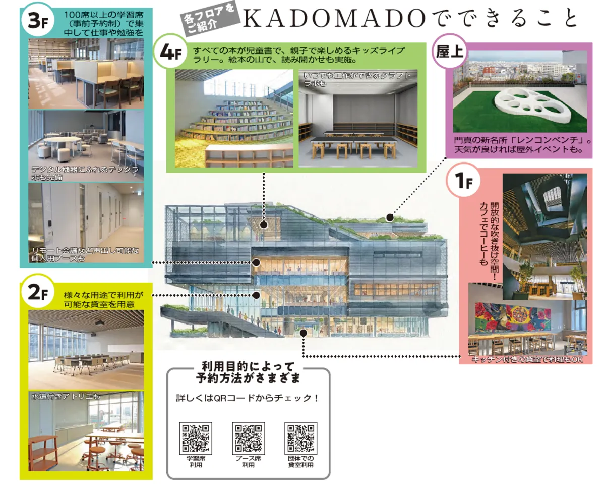 この場所は、本来の図書館の枠に収まらない、創造性と交流が溢れるスペースとしての役割を果たします。今後もKADOMADOは、地域の新たな文化の発信源として、多くの人々に愛されていくことでしょう。