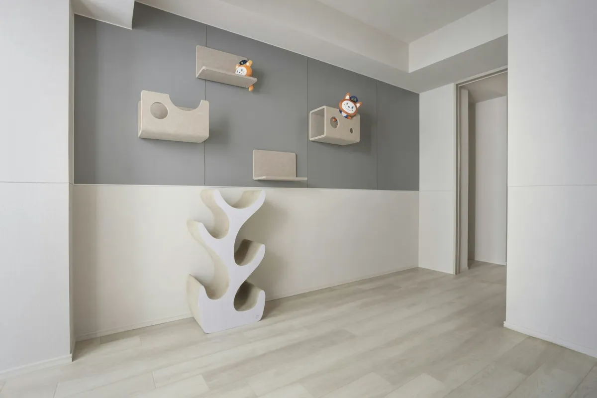 この物件は、猫と共に快適に暮らせるよう、数多くの工夫が施されています。例えば、専用の換気扇付きペットトイレ置場や、猫が外を見られるステップ付きの「猫窓」、さらには猫の遊び場としても使用可能なマグネット壁を設けています。さらに、脱走防止が考慮されたフェンス付きの猫バルコニーもあり、安全に外の景色を楽しめる構造になっています。