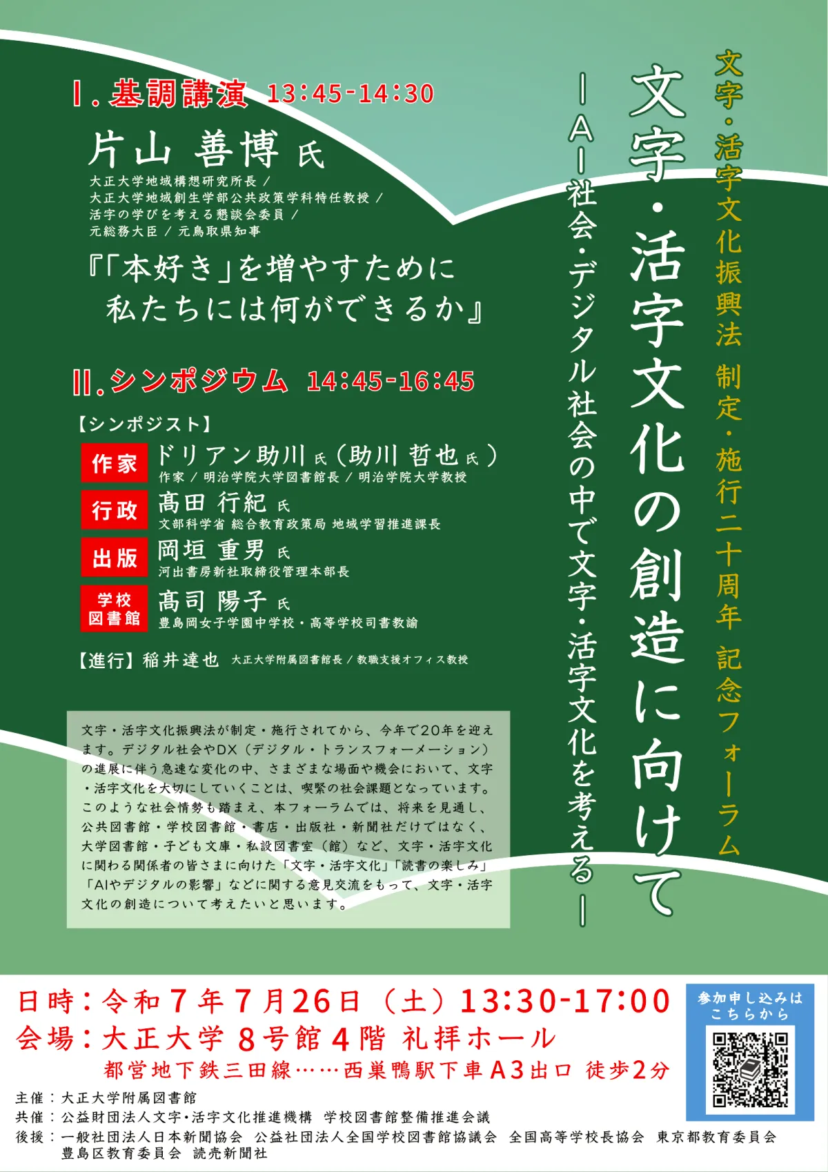 2025年7月26日(土)、大正大学附属図書館が「文字・活字文化振興法制定・施行20周年記念フォーラム」を開催します。本フォーラムは、文字や活字が持つ文化的意義について考える場であり、知識や知恵を次世代に伝える重要な手段である文字・活字文化の振興を目的としています。
