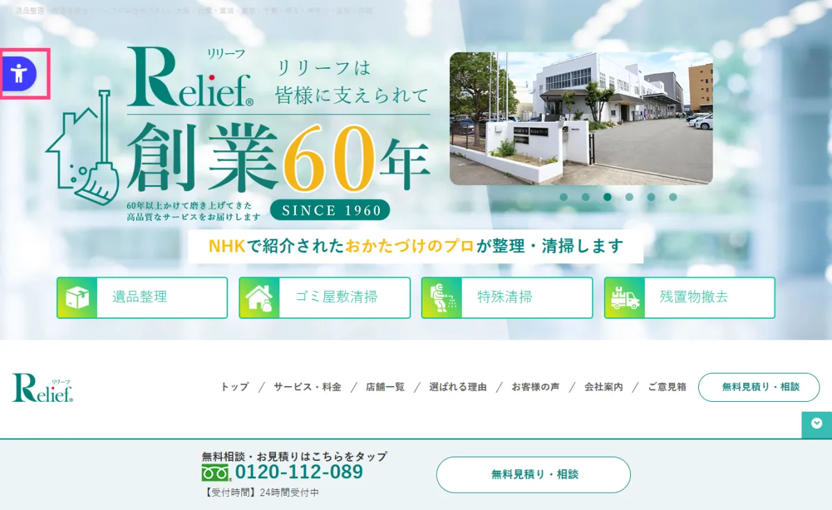リリーフが導入した「ユニウェブ」は、株式会社Kivaが開発したウェブアクセシビリティツールです。導入によって、リリーフのサービスサイトは様々なユーザーにとって読みやすく、使いやすいものになりました。これにより、今までアクセスしにくかったサービスが改善され、ユーザーのニーズに応じた情報を簡単に得られるようになります。ユーザーは、サイトの左上部に設置されたユニウェブのアイコンをクリックすると、音声読み上げや画面のコントラスト切り替えが可能なアクセシビリティメニューが表示されます。