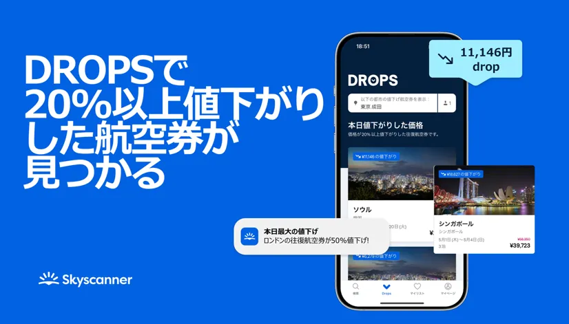旅行をもっとお得に計画したい方必見です。スカイスキャナーから新機能「DROPS」が登場しました。この機能では、直近7日間の平均価格と比較して、航空券が少なくとも20%値下がりしたフライトを紹介します。この機能を利用すれば、気軽に旅行計画を立てて、賢く旅を楽しむことができます。