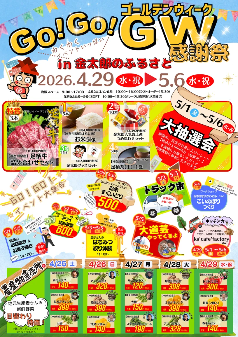 神奈川県南足柄市に位置する道の駅足柄・金太郎のふるさとでは、2026年4月29日(水)から5月6日(水)までの8日間、特別なイベント「GO!GO!ゴールデンウィーク感謝祭in金太郎のふるさと」が行われます。このイベントは、日頃のご愛顧に感謝を込めて、大変盛り上がる内容が用意されています。