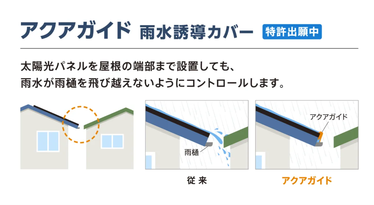 一方で、太陽電池モジュールを軒先まで設置すると、雨水がパネルを滑り降りて雨どいから逸れるという新たな問題が生じます。高島と動力は、この課題にも取り組み、「アクアガイド」と呼ばれる革新的な雨水誘導カバーを開発しました。特許出願中のこのカバーは、雨水を適切に雨どいに導く形状をしており、模擬屋根上での複数回のテストを経て、問題を解決しました。