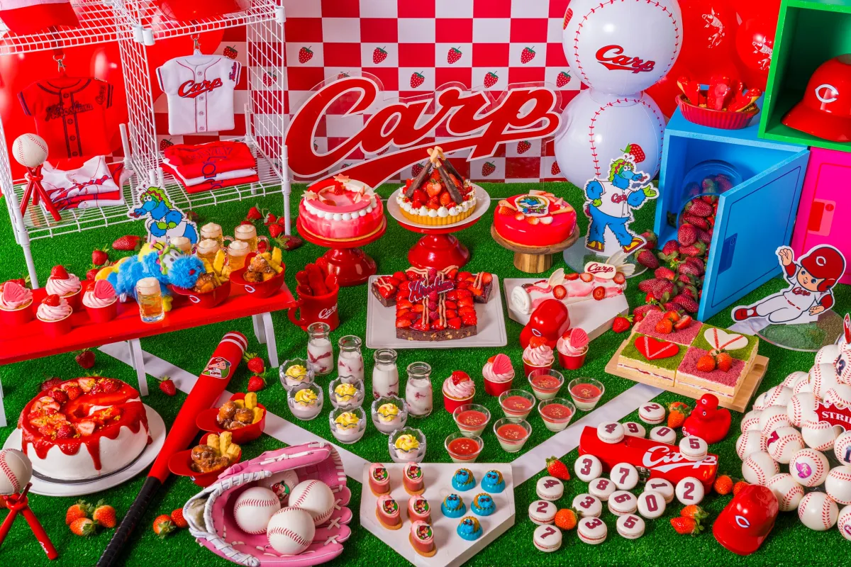 そのテーマは、勝利を願うカープファンで賑わうスタジアム、選手たちの士気が込められたロッカールーム、そしてスラィリーによるティーパーティーの3つ。まるでスタジアム内にいるような雰囲気を体感できる空間が展開され、イメージに合った装飾が施されています。特に、カープ坊やや巨大な苺のオブジェ、ジェット風船型のスイーツ等が登場し、楽しい雰囲気を盛り上げることでしょう。