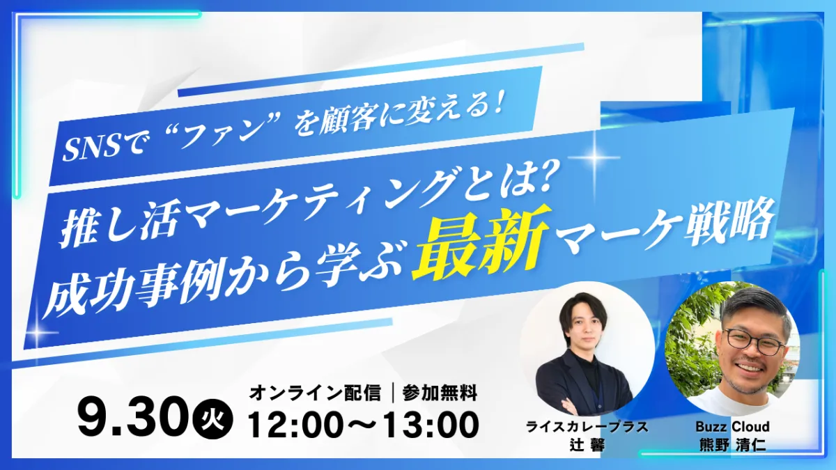 2025年9月30日(火)、BuzzCloud株式会社が株式会社ライスカレープラスと共に、SNSを通じた「推し活マーケティング」に関するウェビナーを開催します。このウェビナーでは、最新のマーケティング戦略を成功事例を交えて学ぶことができます。参加は無料ですが、興味がある方はぜひ事前に申し込んでください。