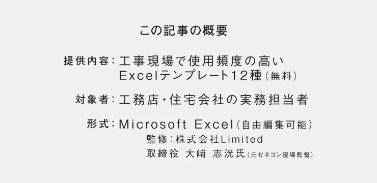 本プロジェクトでは、株式会社Limitedの取締役である大﨑志洸氏が監修しています。大﨑氏は兵庫県出身で、大手ゼネコンでの施工管理や商社の建設事業部、内装会社での代表を務めてきました。施工実績は5,000件以上を誇り、現在は現場支援や人材育成のコンサルティング事業を展開しています。その豊富な経験が、提供されるテンプレートに反映されています。