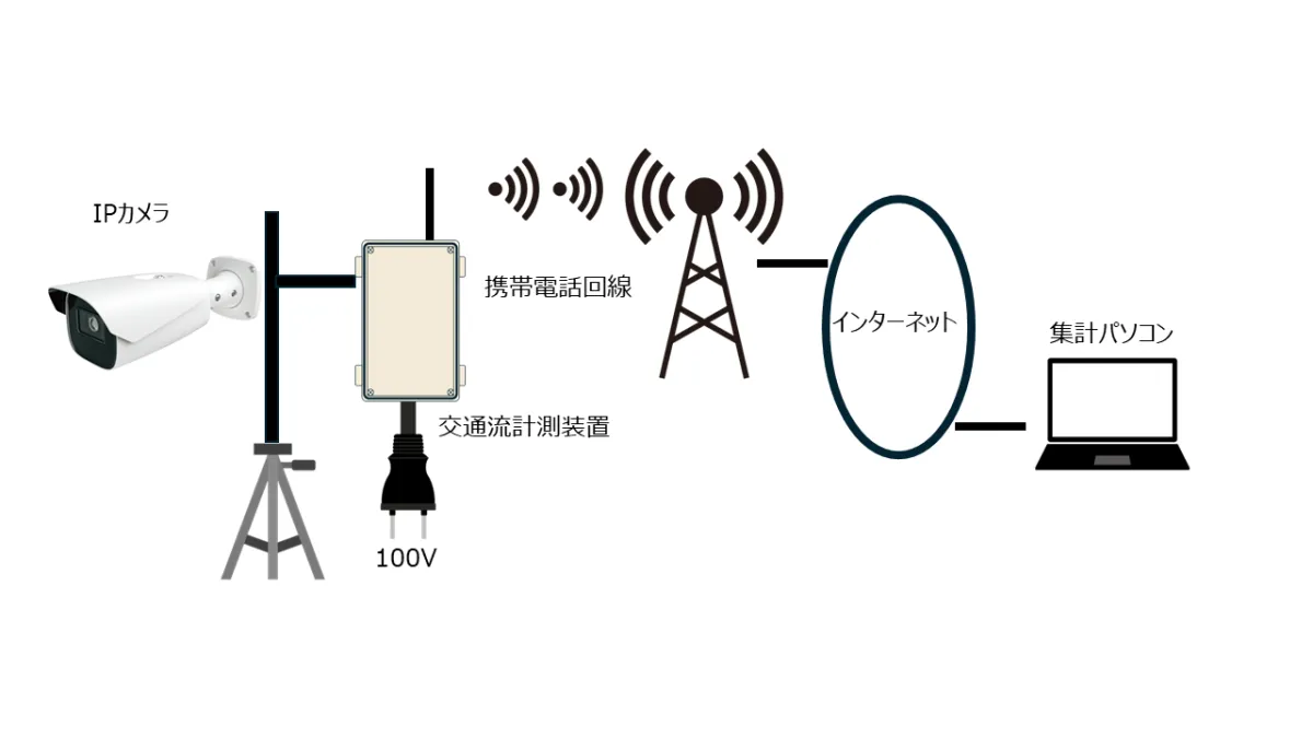 この交通流計測装置は、AIエッジボックスとLTEルータを内蔵した機器です。カメラによるデータ収集を行い、集計PCに送信されます。具体的には、計測場所に設置されたカメラが交通流をモニタリングし、条件を設定した上で自動的にデータが集計されます。これにより、リアルタイムでの交通状況の把握が可能です。