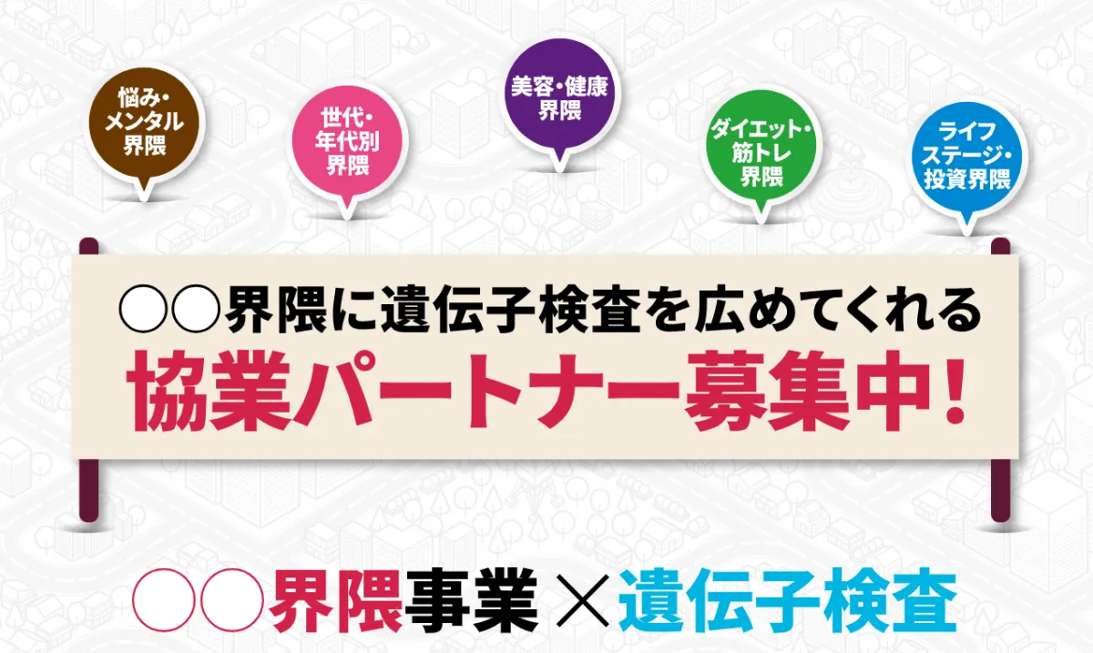 KEAN Healthでは、遺伝子検査の市場拡大を目指し、多様な分野での協業を推進しています。そのため、「遺伝子検査を広める協業パートナー」を募集中です。具体的には、エンターテイメント、恋愛・婚活、キャリア支援、美容、旅行、グルメなど、さまざまな業界でのパートナーシップが欲しいとのことです。