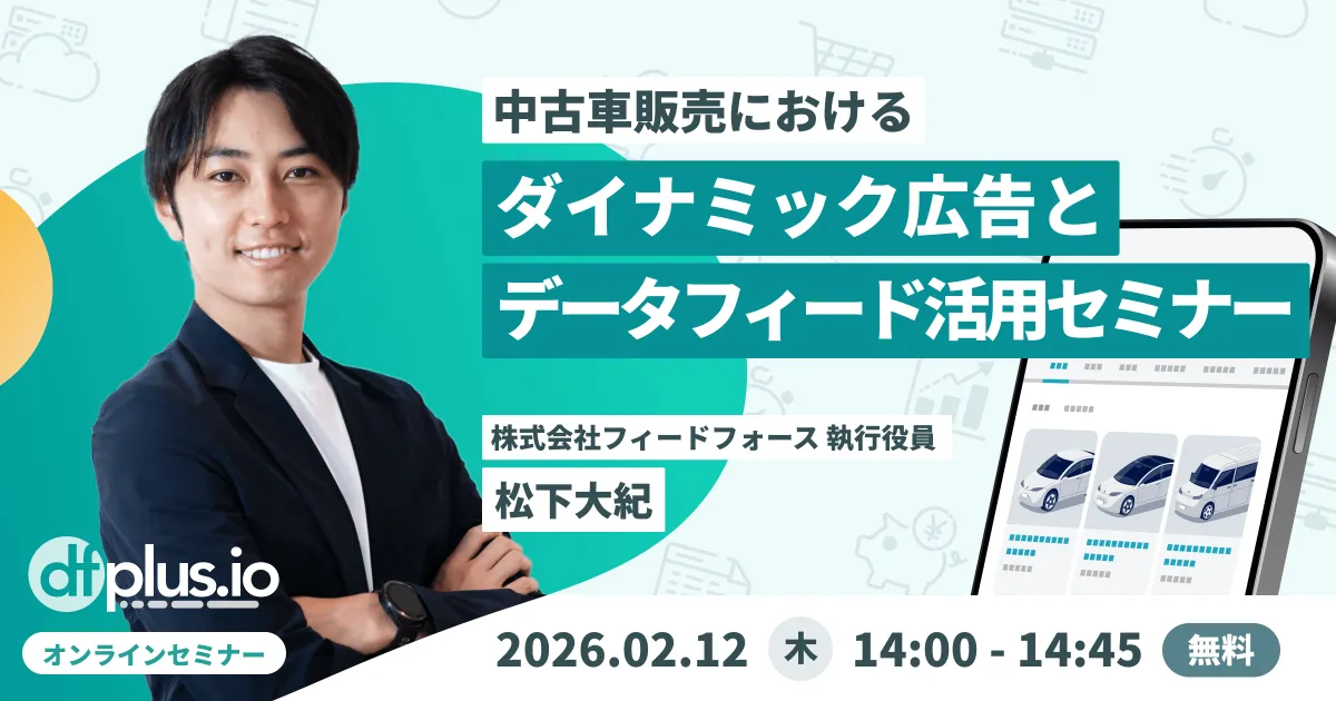 2026年2月12日(木)14時から、株式会社フィードフォースが主催する「中古車販売におけるダイナミック広告とデータフィード活用セミナー」が開催されます。このセミナーでは、中古車販売事業者向けに、在庫データを基にした集客設計の新たなアプローチを学ぶことができます。
