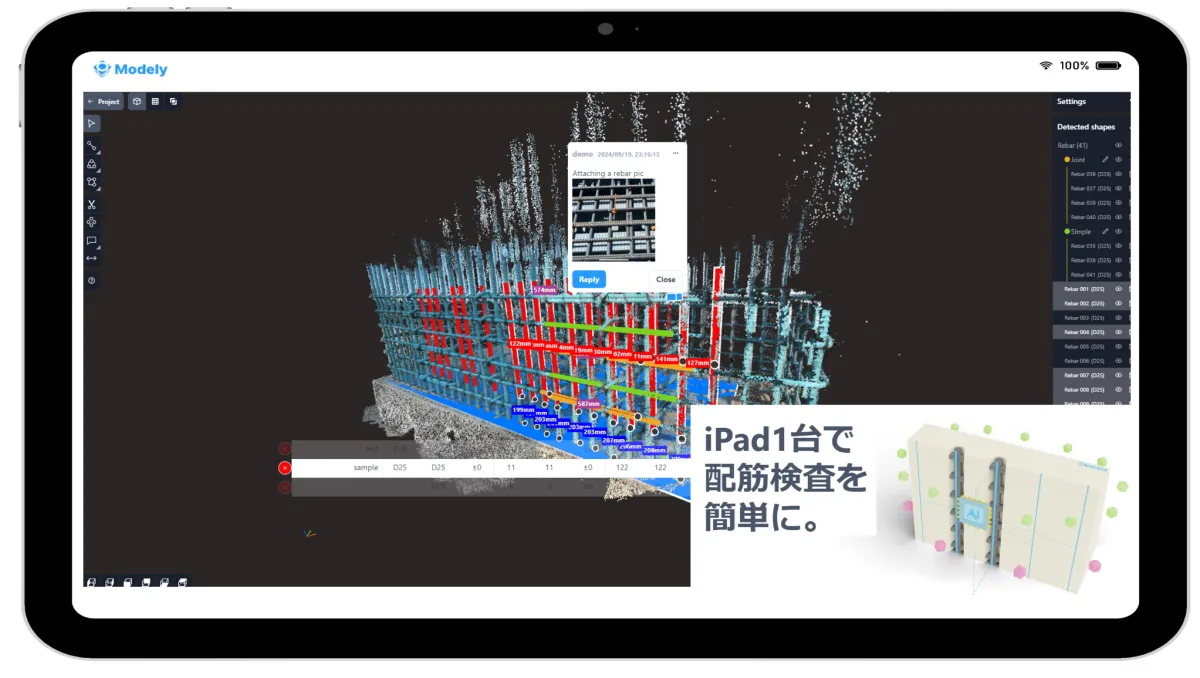 「Modely」は、LiDAR技術を利用して鉄筋の点群データを取得し、自動で検査を行うシステムです。iPadなどのデバイスでスキャンした点群データをアップロードし、画面上で検査範囲を簡単に指定することで、範囲内の鉄筋を自動的に検出し、モデル化します。このプロセスは、従来の手作業による検査と比べて飛躍的に効率化され、精度の高い計測を可能にします。