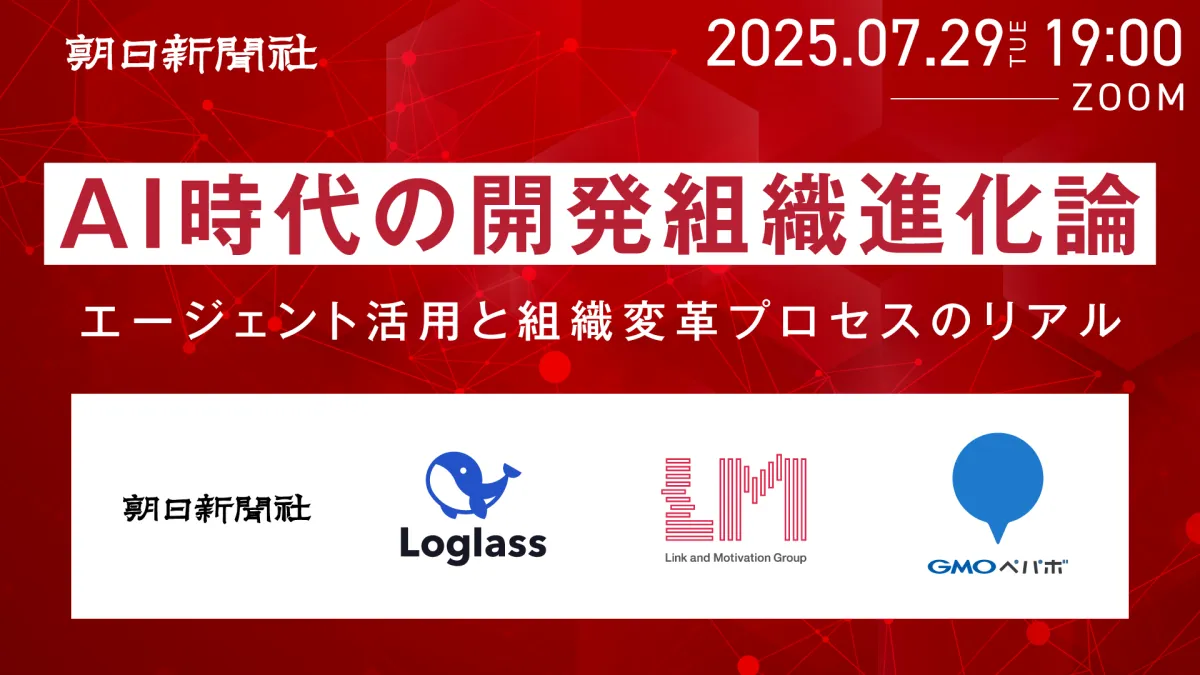 株式会社朝日新聞社は、2025年7月29日(火)19時から20時30分にかけて、オンラインイベント「AI時代の開発組織進化論 ─エージェント活用と組織変革プロセスのリアル」を開催します。このイベントは、急成長を遂げる生成AI技術を活用し、開発組織の生産性を向上させるための戦略や実践方法を探るものです。