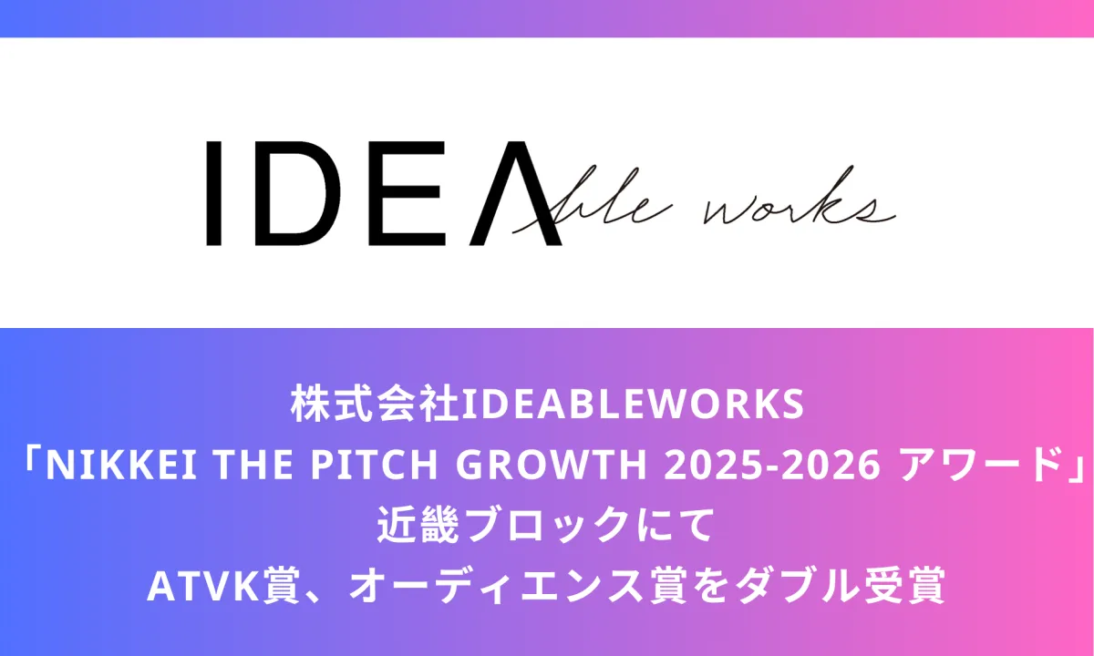 2025年1月に行われた「NIKKEI THE PITCH GROWTH 2025-2026 バーチャルピッチラン 近畿ブロック」において、IDEABLE WORKSは以下の二つの賞を受賞しました。まず一つ目はオーディエンス賞で、これは視聴者からの支持を基に評価されるもので、最も共感を得た企業に贈られます。二つ目はATVK賞で、アート&テクノロジー・ヴィレッジ京都が特別に選出する賞です。