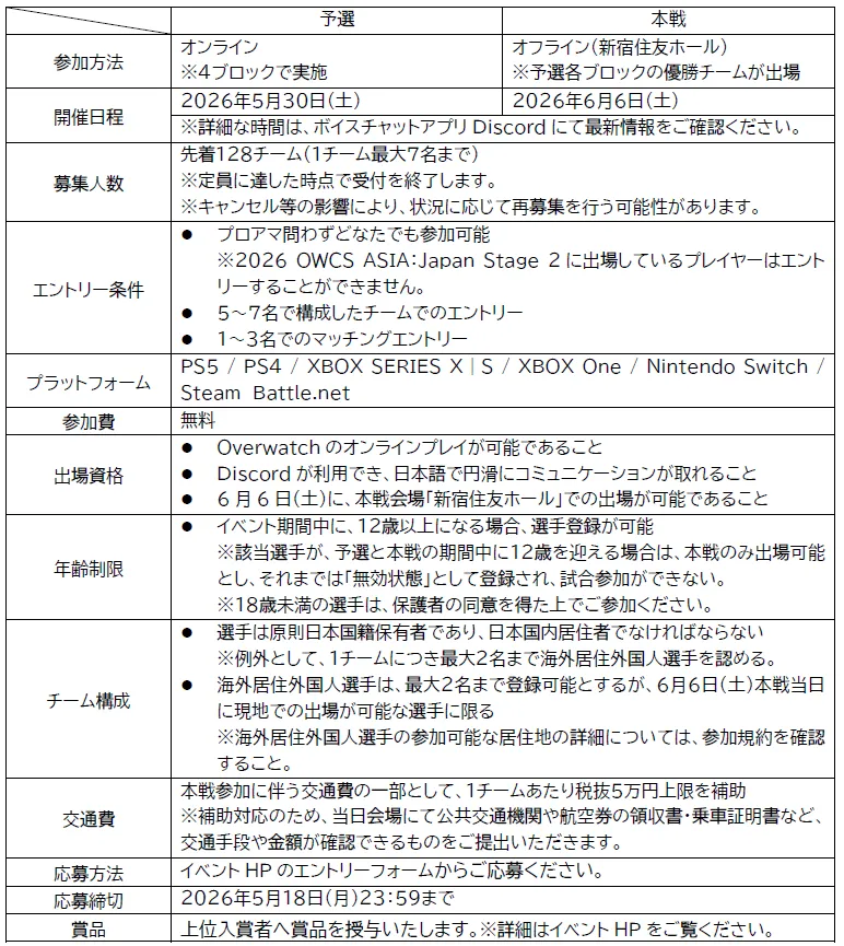 本戦では、予選を勝ち抜いたチームによる準決勝・決勝戦が行われるほか、『Overwatch』の魅力を体感できる体験ブースも設置されます。さらに、著名なゲーム配信者による実況や解説をリアルタイムで楽しむことができ、ファンにはたまらない一日となるでしょう。