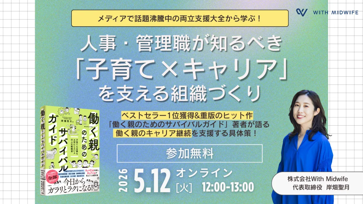 2026年5月12日(火)、株式会社With Midwifeが主催するオンラインセミナーが開催され、育児とキャリアの両立を支援するための新しいアプローチについて深く掘り下げられます。このセミナーは、企業の人事や管理職を対象にしており、著書『働く親のためのサバイバルガイド』の著者である岸畑聖月氏が登壇します。