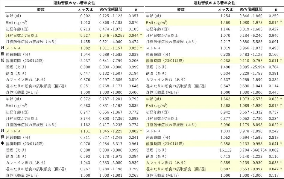 これにより、月経随伴症状の重症度に影響する因子は、運動習慣によって異なることが明らかになりました。運動習慣のない女性にはストレスや月経の持続時間が主な要因となる一方で、運動をする女性には生活習慣が影響を与えていることが示されました。