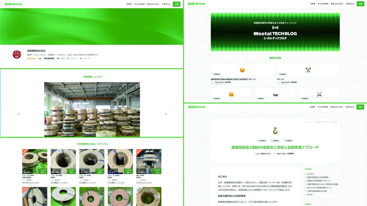 Meetalは、鉄鋼素材・モノづくり業界の技術知識やナレッジを共有するための「Meetal TECH BLOG」も提供します。このプラットフォームでは、企業が自社の技術情報を発信したり、業界に関する記事を共有することができ、SEO効果も期待できます。この機能によって、業界全体の知識が集まり、相互に学び合うことができる環境が整います。