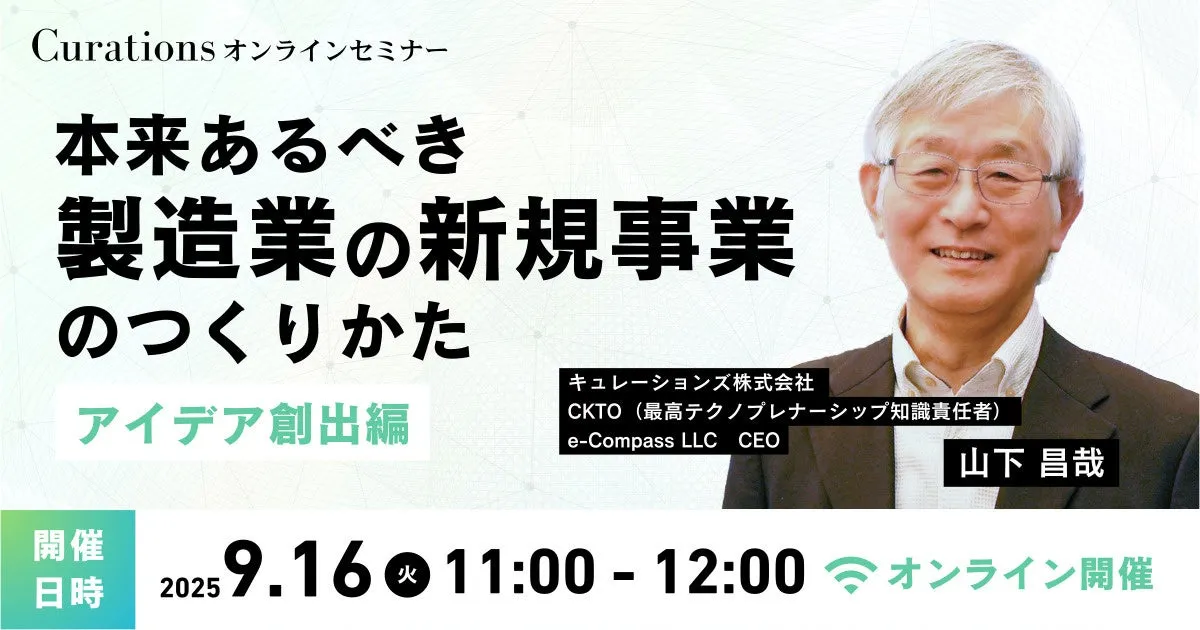 2025年9月16日(火)11:00から、キュレーションズ株式会社が主催する無料オンラインセミナーが開催されます。このセミナーは、「本来あるべき製造業の新規事業のつくりかた〜アイデア創出編〜」をテーマに、製造業の現場で新しいビジネスを生み出すための戦略的なアプローチに焦点を当てています。