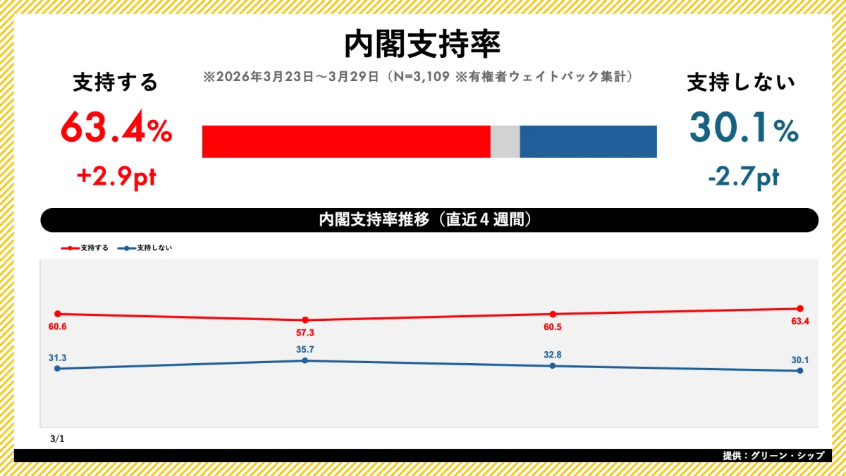 高市内閣の支持率は63.4%に達し、前週から2.9ポイントの増加を記録しました。この数値は、国民から高い評価を受けていることを示しています。支持率が過去数週間で徐々に増加していることから、内閣の政策や政治的歩みに対する期待感が高まっていることが伺えます。