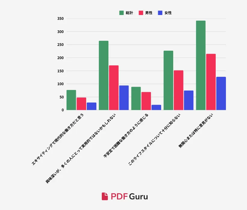 アンケートは2段階で行われました。初期のスクリーニング調査では、1,000人の男女を対象にリモートワークに関する一般的な意識を調査しました。その結果、約34%の人々は「特に意見がない」と答え、リモートワークに対する関心がそれほど高くないことが浮き彫りになりました。