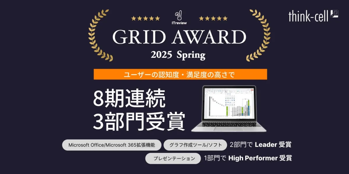 think-cell Japan株式会社は、国内最大級のIT製品レビューサイトである「ITreview」が主催する「ITreview Grid Award 2025 Spring」にて、見事に3部門を受賞しました。この受賞は、技術力やユーザビリティの高さを示すものであり、同社が提供するPowerPoint拡張ツール「think-cell」が多くのユーザーに支持されていることを証明しています。