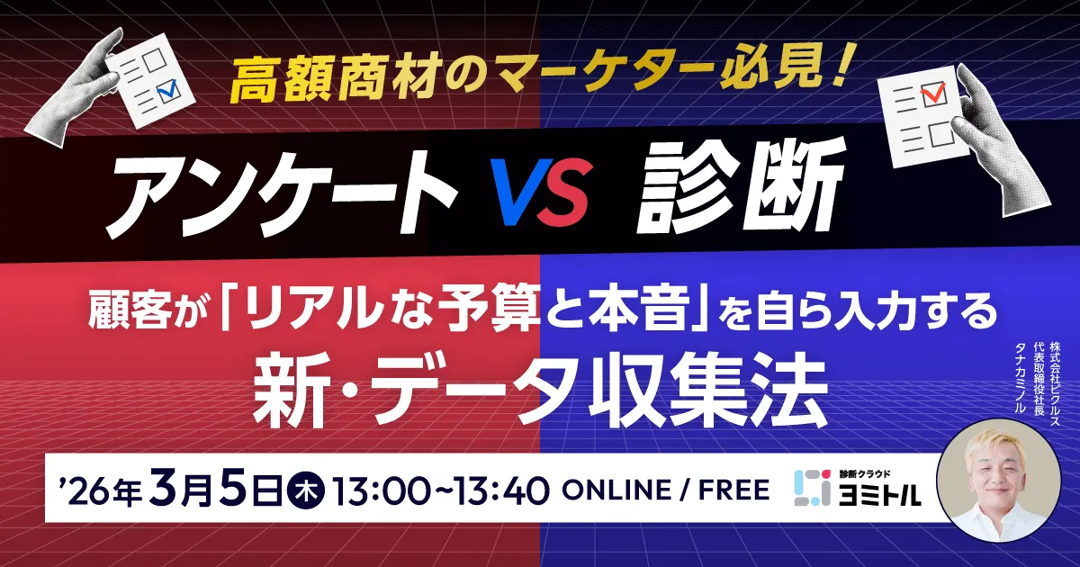 2026年3月5日、株式会社ピクルスが高額商材に特化したオンラインセミナー「【アンケート vs 診断】高額商材のマーケター必見!顧客が『リアルな予算と本音』を自ら入力する新・データ収集法」を開催します。このセミナーでは、マーケティング戦略において最大の課題である顧客の本音を如何に引き出すか、その具体的方法と実践例が紹介されます。
