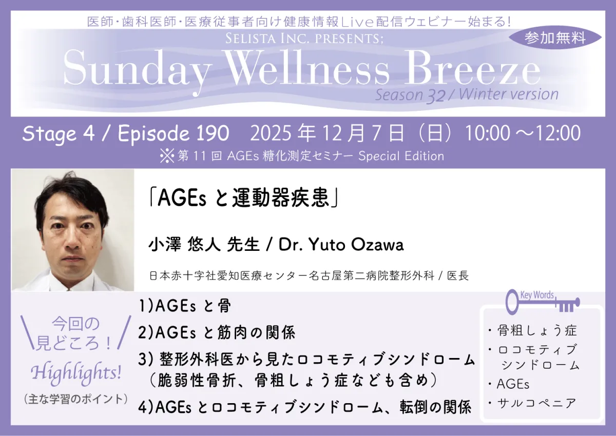 今回のセミナーでは、特に『AGEs(終末糖化産物)と運動器疾患』に焦点を当てた内容となっています。小澤先生は、以下のようなポイントに基づいて、受講者に医療的な視点からの情報提供を行います。