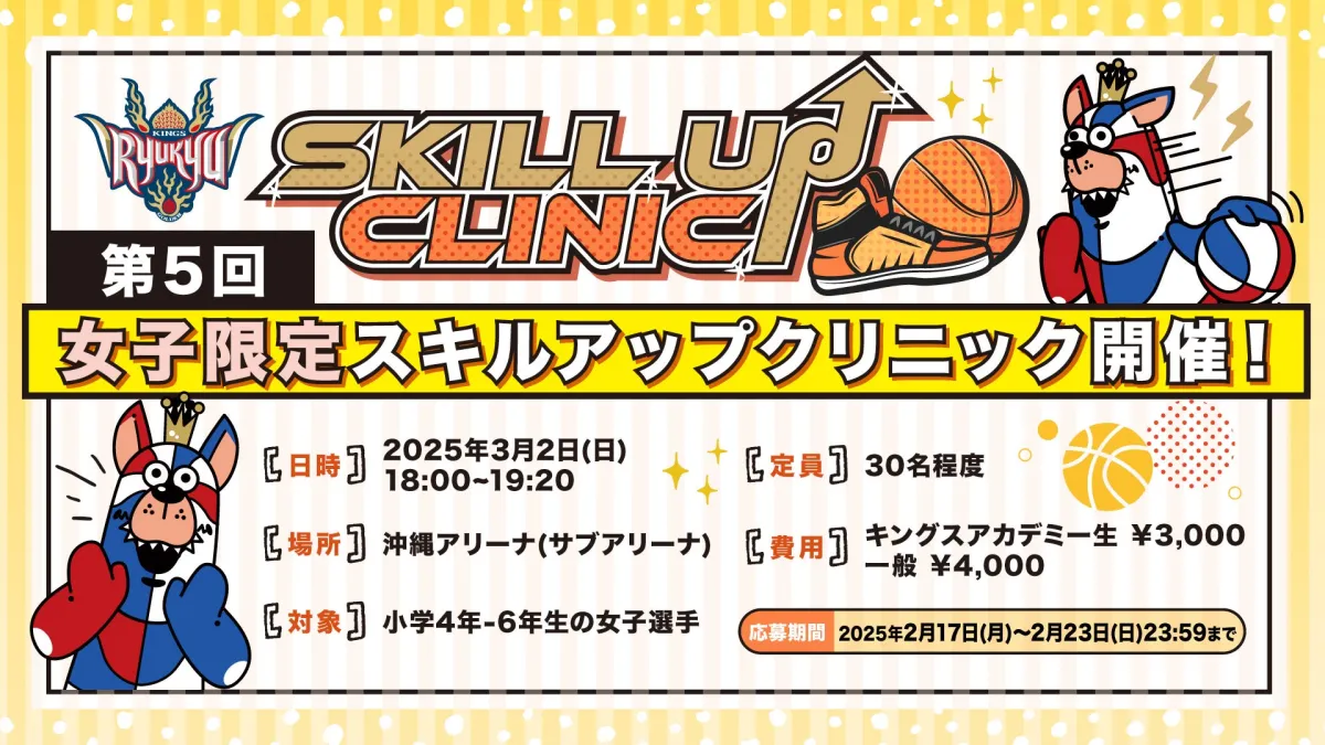 琉球ゴールデンキングスアカデミーは、2025年3月2日(日)に「第5回女子限定スキルアップクリニック」を開催します。このイベントは、小学4年生から6年生の女子を対象としており、バスケットボール技術の向上と戦術理解を深めることを目的にしています。