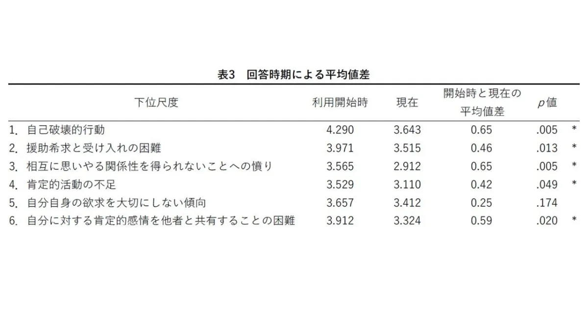 今回の研究では、セルフケアの実施が発達障害者の行動や感情にどのような影響を及ぼすかを分析しました。その結果、1つの項目では「自己破壊的行動」と、もう1つの項目では「相互に思いやる関係性への憤り」について、他の項目に比べて顕著な改善が見られました。特に、就労開始時と現在との比較で、6つの下位尺度の中から5因子において有意な差が認められました。これにより、セルフケアの重要性が科学的に裏付けられ、今後の支援方法に役立つデータとなるでしょう。