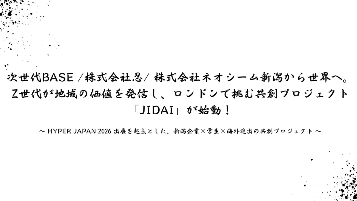 新潟から国際舞台へ挑む新たな共創プロジェクト「JIDAI」が、本年度発足しました。地域企業である株式会社忍と株式会社ネオシームがタッグを組み、新潟の文化や特産品をZ世代の視点で発信し、2026年7月には英国・ロンドンで行われる「HYPER JAPAN」に出展を予定しています。このプロジェクトは、地域の価値を次世代に引き継ぎ、同時に学生たちに国際的な挑戦の場を提供することを目的としています。