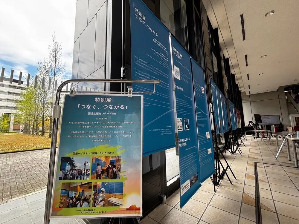 この展示は、先日行われた夏期セミナーの実習の一環として、関西万博を訪れた学生たちの成果がTBSの関心を引いたことから生まれました。特に関西万博の国連パビリオンでの企画をもとにした内容となっており、戦争を経験した世代の証言や資料が紹介されています。