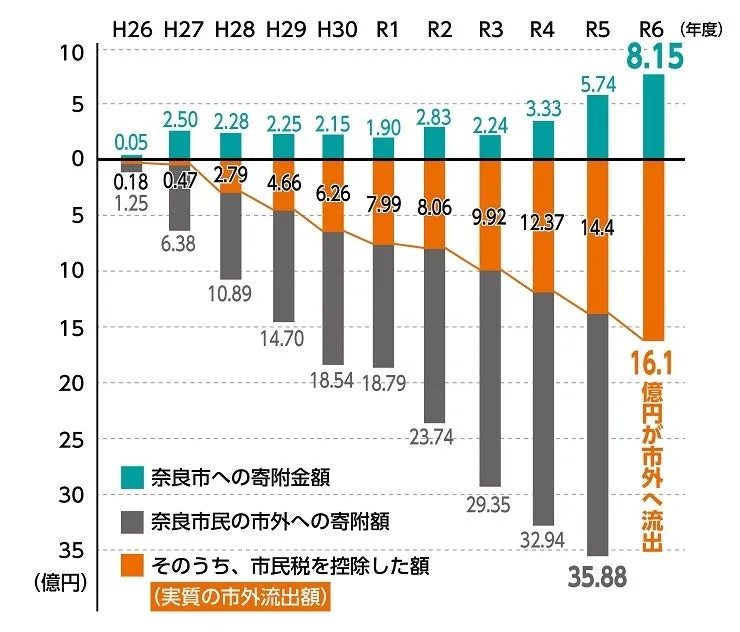 奈良市が実施するふるさと納税が、令和6年度に入ってから寄附総額が8億500万円を超え、見事に単年度黒字を達成しました。これは市民、寄附者の皆さまの積極的な参加のおかげです。この金額は、令和5年中に寄附を行った奈良市民による寄附総額約36億円に基づいて成り立っています。