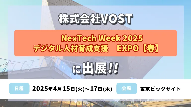 株式会社VOSTは、2025年4月15日から17日まで東京ビッグサイトで開催される「NexTech Week2025」に出展します。このイベントは、デジタル人材育成支援をテーマにしており、企業におけるDX(デジタルトランスフォーメーション)推進に寄与することを目的としています。