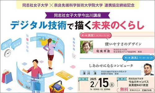 同志社女子大学は、毎年今出川キャンパスで公開講座を開き、教育と研究の成果を社会に還元しています。今年度は、特に注目すべき講演会「デジタル技術で描く未来のくらし」を2月15日(土)に実施します。この講座は、2024年6月に奈良先端科学技術大学院大学との連携協力を締結したことを記念するものです。