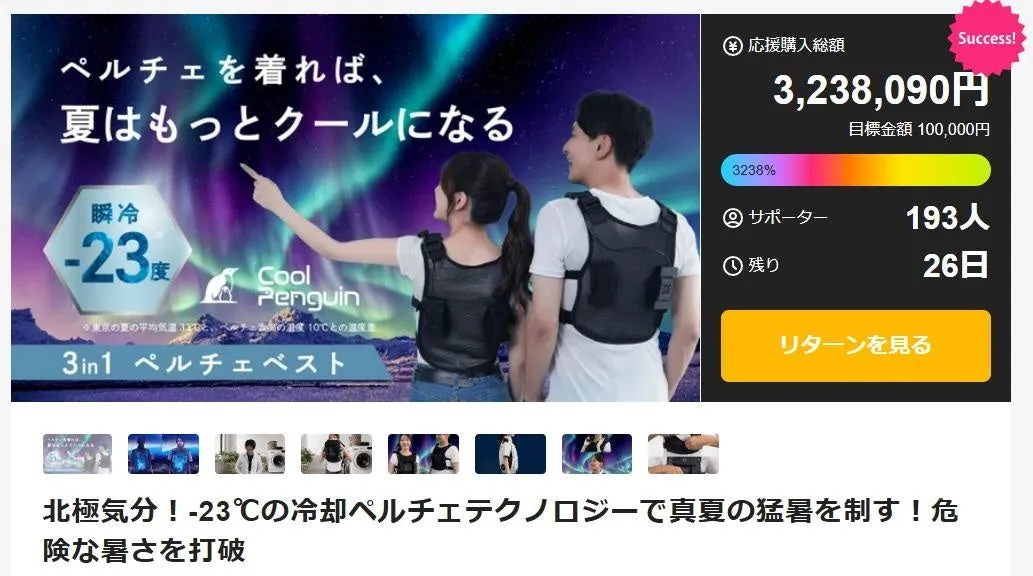 現在、「ペルチェベスト」はクラウドファンディングサイト「Makuake」で先行販売されています。特に早割プランでは最大48%OFFで購入が可能で、多くのユーザーに好評を博しています。販売期間は2025年7月19日から8月22日までとのことです。
