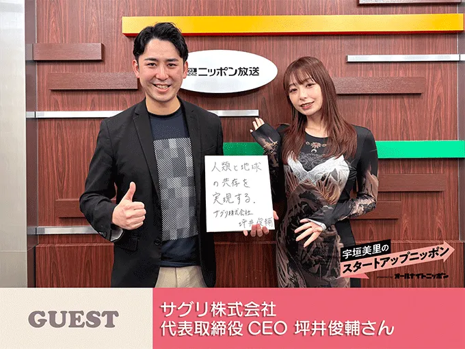 2月24日(火)、宇垣美里がパーソナリティを務めるポッドキャスト番組『宇垣美里のスタートアップニッポン powered by オールナイトニッポン』の第60回が配信された。この回では、サグリ株式会社の代表取締役CEO、坪井俊輔氏がゲストとして登場し、宇宙データを活用した農業の革新について語った。