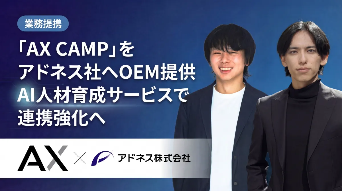 株式会社AXが、企業研修を専門とするアドネス株式会社に対して自社のAI研修プログラム「AX CAMP」をOEM形式で提供することが決定しました。この取り組みによって、アドネス社が展開する次世代型教育プログラム「スキルプラス」にAIに関する実務的な研修コンテンツが加わり、企業のAI人材育成をより推進することが期待されています。