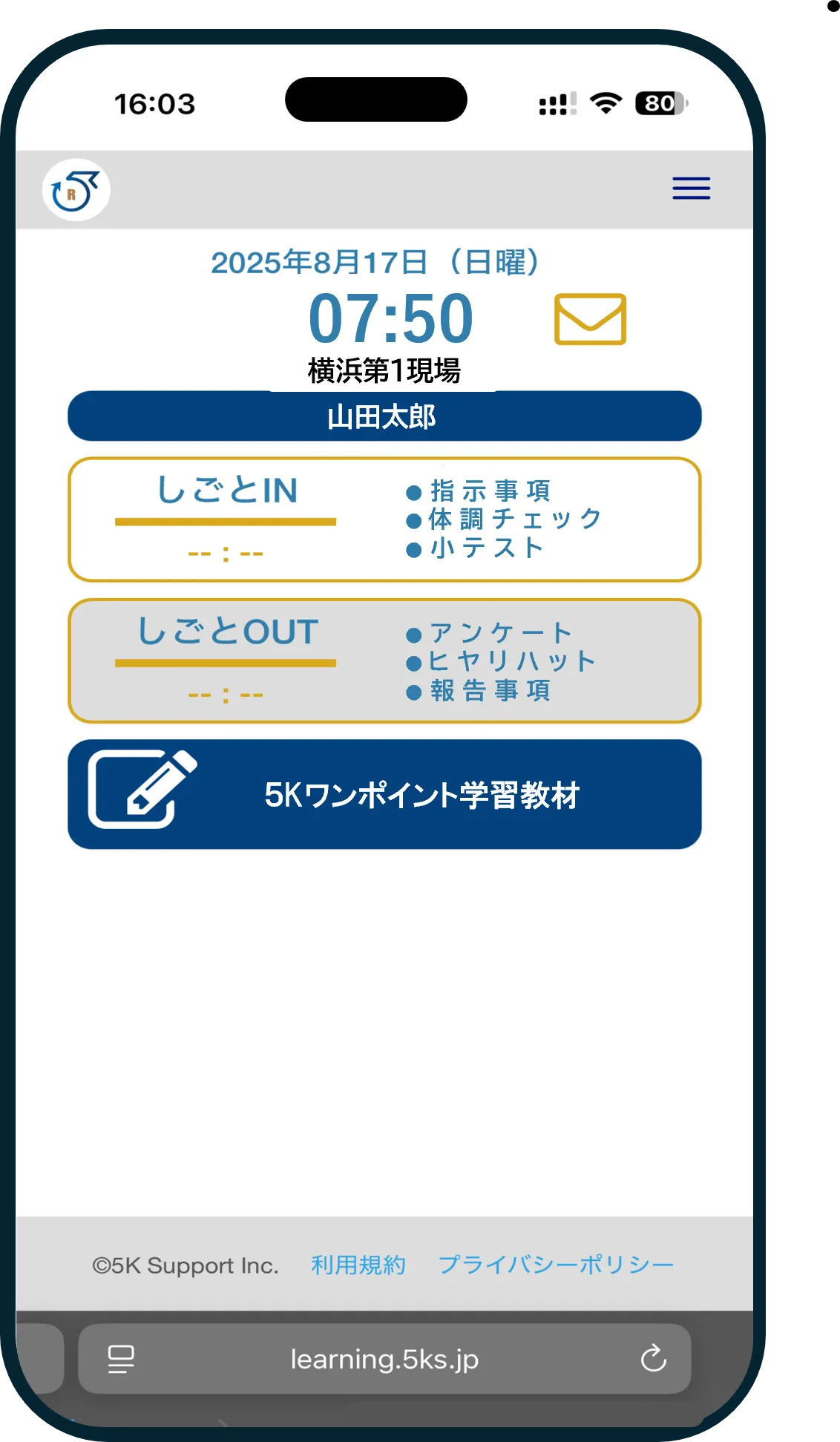 5Kサポートは、事故がなかなか減らない理由を「継続的な安全教育の不足」と解析。その上で、学びが途切れないように「出勤時に3分間スマホで学ぶ」という手法を導入しました。これによって、労働者が自発的に知識を深め、安全衛生法が身に付く仕組みが作られています。