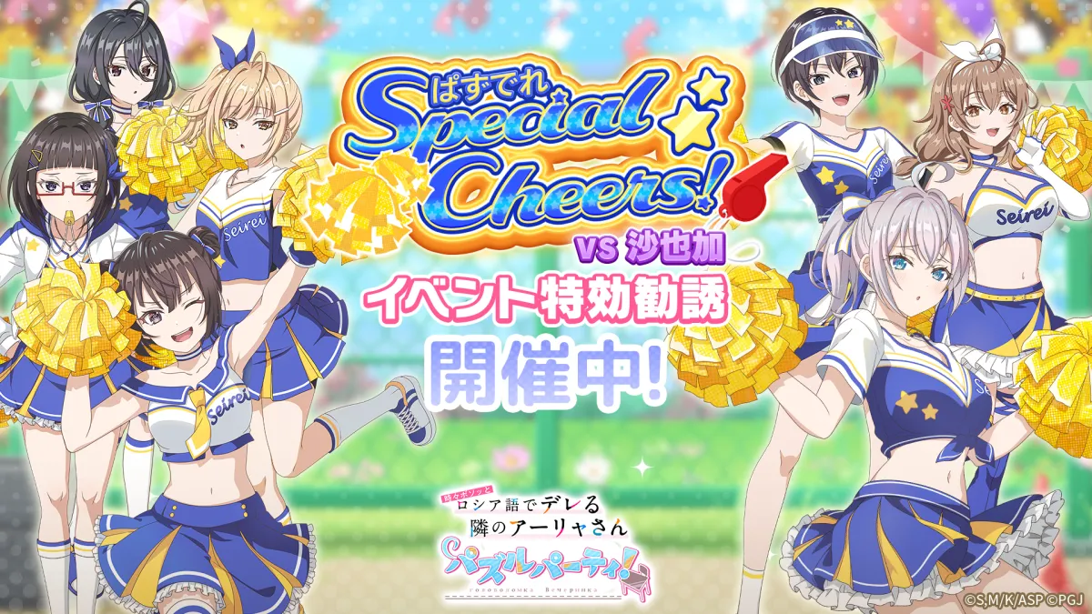 ゲーム内で展開される「ぱずでれスペシャルチアーズ!VS沙也加」では、アーリャをはじめとするマーシャ、有希、綾乃、茅咲、沙也加、乃々亜など、チアガール姿に身を包んだ7名のキャラクターが活躍します。期間限定で登場する特効キャラクターのピックアップも見逃せません!