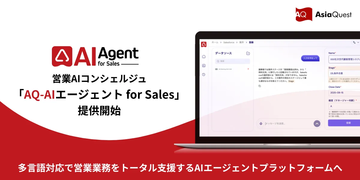 アジアクエストが新たに報告した『AQ-AIエージェント for Sales』は、営業現場のデジタル変革を支援する革新的なAIプラットフォームです。このエージェントは、商談議事録や営業管理情報の入力作業を効率化する機能を備えており、企業の営業業務をトータルにサポートします。今回のリリースでは、特に商談議事録を解析し、SalesforceやHubSpot、Kintoneなどの営業支援ツール(SFA)に自動で必要事項を入力する機能が強調されています。