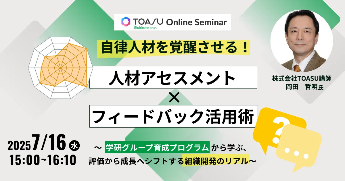 2025年7月16日(水)、学研グループの株式会社TOASUが主催するセミナー「自律人材を覚醒させる!人材アセスメント×フィードバック活用術」がオンラインで行われます。このセミナーでは、人材アセスメントを利用した自律型人材育成の手法を紹介し、組織における成長を促進するための具体的な方法が提案されます。