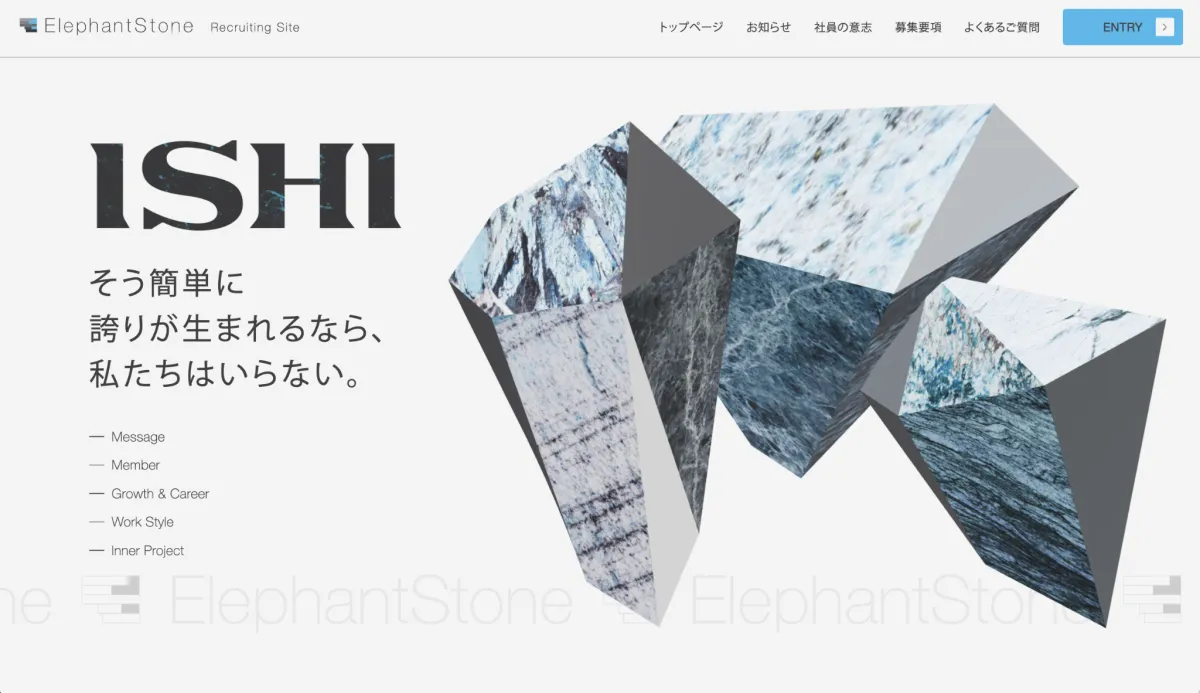 新しい採用サイトの特徴的な点は、その名が「エレファントストーン」という会社名からヒントを得ていることです。ここで注目されるのは「ストーン(石)」です。この「石」は揺るぎない基盤や原石としての存在を象徴しており、磨かれることでその美しさを発揮します。そして、意志の強さという意味も込められています。この両者の意味が重なり合い、エレファントストーンが目指すビジョンを形成しています。