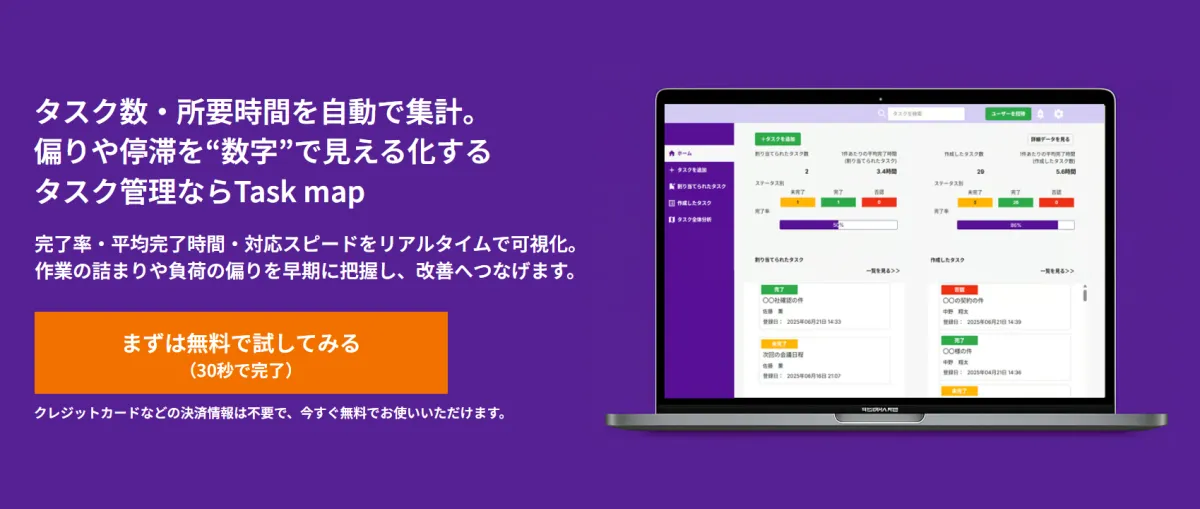 Taskmapは、クレジットカード情報などの決済情報は不要で、30秒ほどで無料登録が可能です。業務の効率化に貢献するこのツールをぜひ試してみてください。詳細は公式サイト