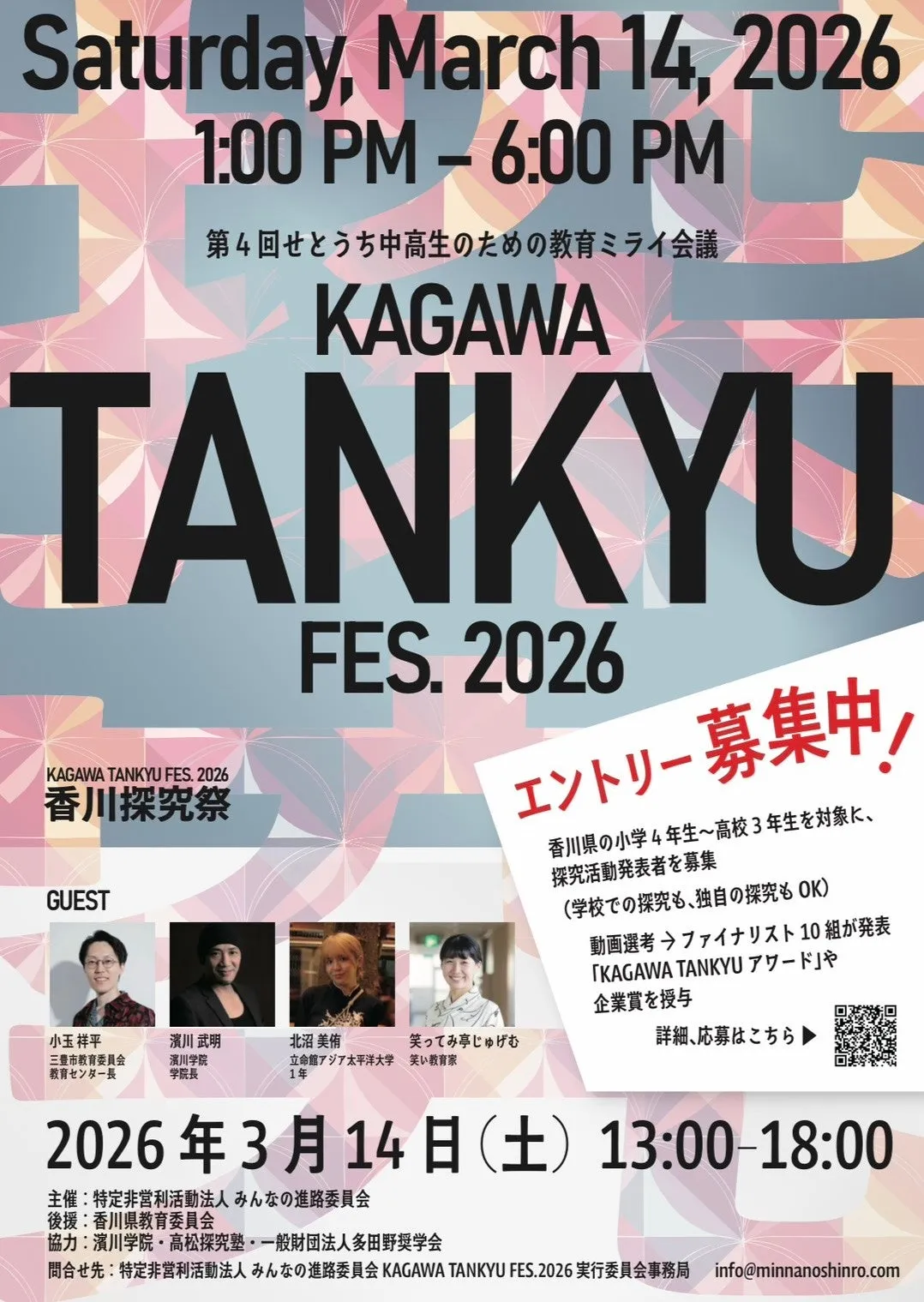特定非営利活動法人みんなの進路委員会が主催する「第4回せとうち中高生のための教育ミライ会議 KAGAWA TANKYU FES.2026」が、2026年の3月14日、香川県の高松南部3町商店街にて開催されることが決定しました。このイベントは、香川県内に在住または在学する小学4年生から高校3年生を対象とした探究活動の発表の場となります。