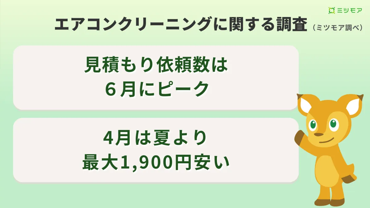 株式会社ミツモアによると、エアコンクリーニングの依頼は4月から急激に増加し、特に6月にはピークを迎えます。実際、依頼数は6月に4月の約2倍に増加。これに伴い、料金も高騰すると言われています。6月の料金は、4月と比較して1,000円から1,900円も上昇することがあり、特にお掃除機能付きのエアコンではその傾向が顕著です。