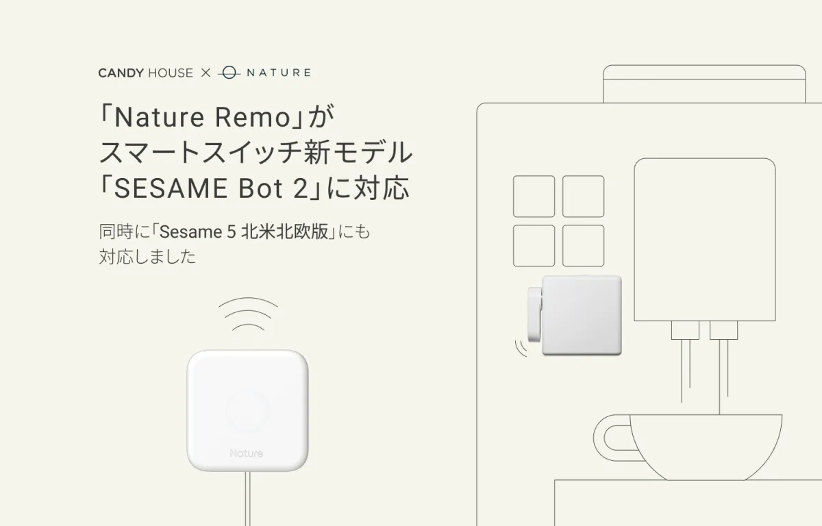 「自然との共生をドライブする」をミッションに掲げるNature株式会社が開発・販売するスマートリモコン「Nature Remo」シリーズが、CANDY HOUSE JAPAN株式会社が開発・販売するスマートスイッチ「SESAME Bot 2」とスマートロック「Sesame 5 北米北欧版」に対応しました。