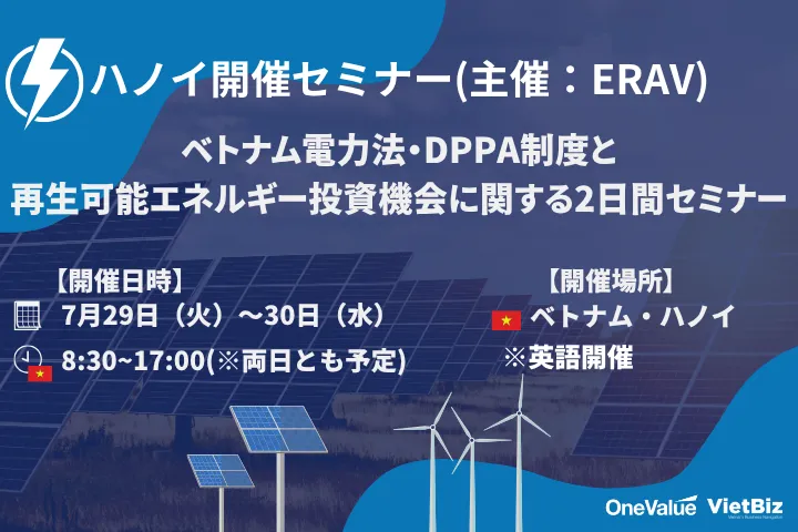 このセミナーは、参加者にベトナムの電力規制局(ERAV)から最新の法令と電力市場の動向を解説し、電力事業や再生可能エネルギーへの投資機会を提供することを目的としています。日本企業の管理職や関連する関係者にとって、ベトナムでの事業展開を考える際に必要な情報源となるでしょう。
