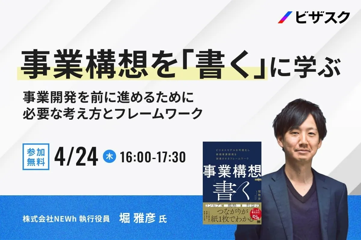 株式会社ビザスクが主催する無料のオンラインセミナー「事業構想を「書く」 に学ぶ」が、2024年4月24日(木)16:00から開催されます。このセミナーは、事業開発を推進するために必要な考え方やフレームワークをテーマに、株式会社NEWhの執行役員である堀雅彦氏をお招きします。