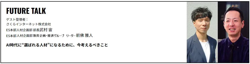 さくらインターネット株式会社の武村 宙氏と前佛 雅人氏を招いた特別講演が、SAK University 東京イノベーションキャンパスで行われます。2026年2月26日(木)、19時からのこの講演では、「AI時代に“選ばれる人材”になるために今考えるべきこと」と題して、IT業界での人材育成についての貴重な知見が共有されます。