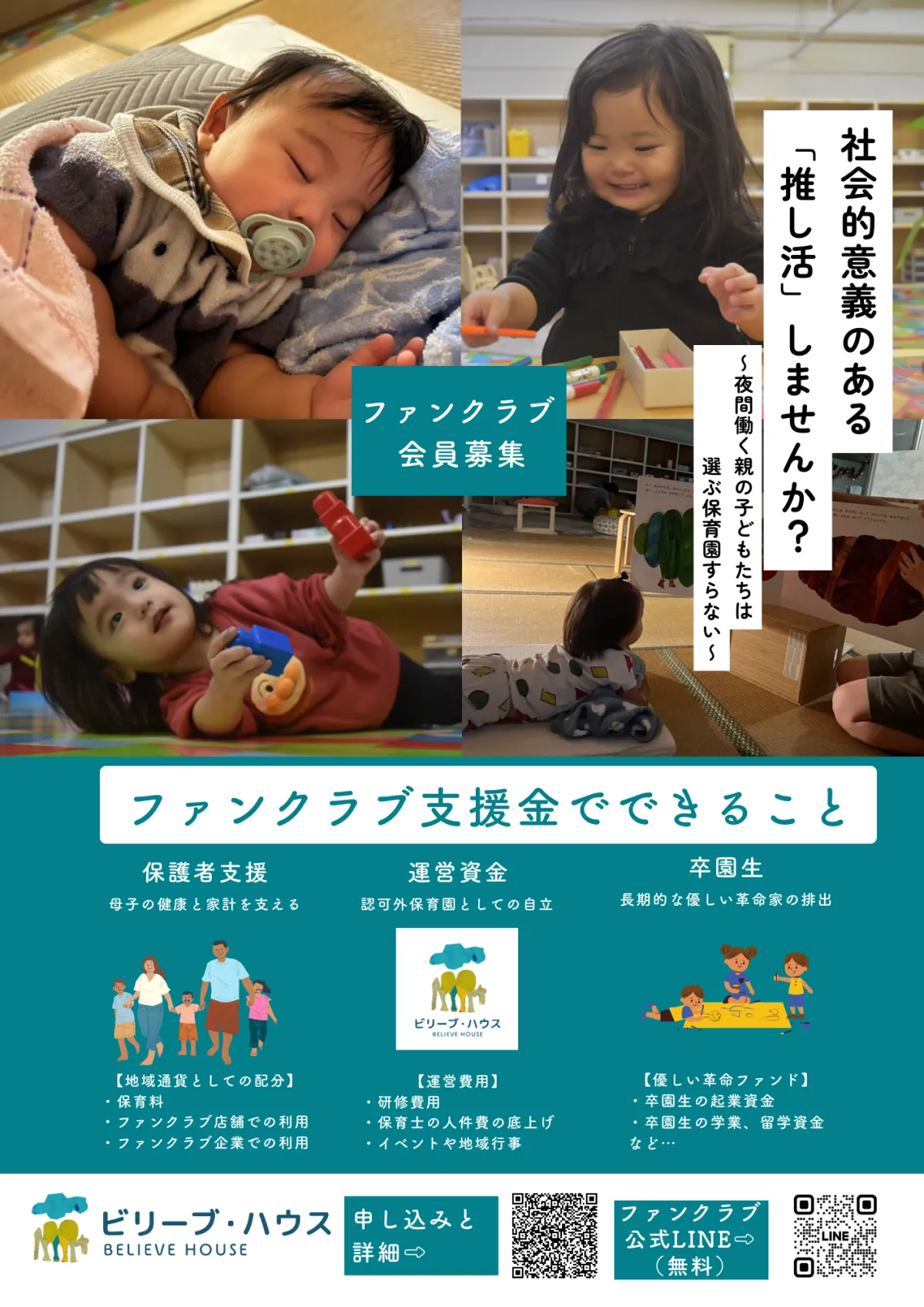 ビリーブ・ハウスでは「根拠のない自信を育み、優しい革命家を輩出する」という使命のもと、地域に根ざした夜間保育の実現を目指しています。ぜひ、ファンクラブへの参加を考え、共に子どもたちの未来を応援していただければと思います。詳細な資料や申し込みは、公式ウェブサイトからアクセス可能です。